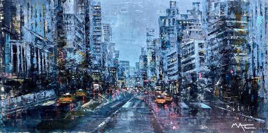 Mark’s stunning images are created with little conventional brush work. Instead he uses a wide range of alternative tools including rollers and scrapers to achieve the textures and effects which are characteristic of his work. His use of newsprint adds a further layer of texture to each piece; while some of the exposed newsprint is by design, other parts occur naturally where the rollers and scrapers lay the paints unevenly which reflects the unexpected and unpredictable nature of life lived at speed in the city.